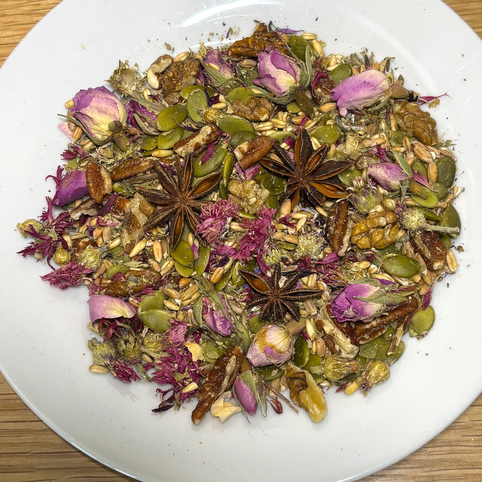 Oat Groats, Pumpkin Seed, Spelt Grain, Walnuts, Pecans, Rose Buds, Star Anise, Oregano, Red Cornflowers.