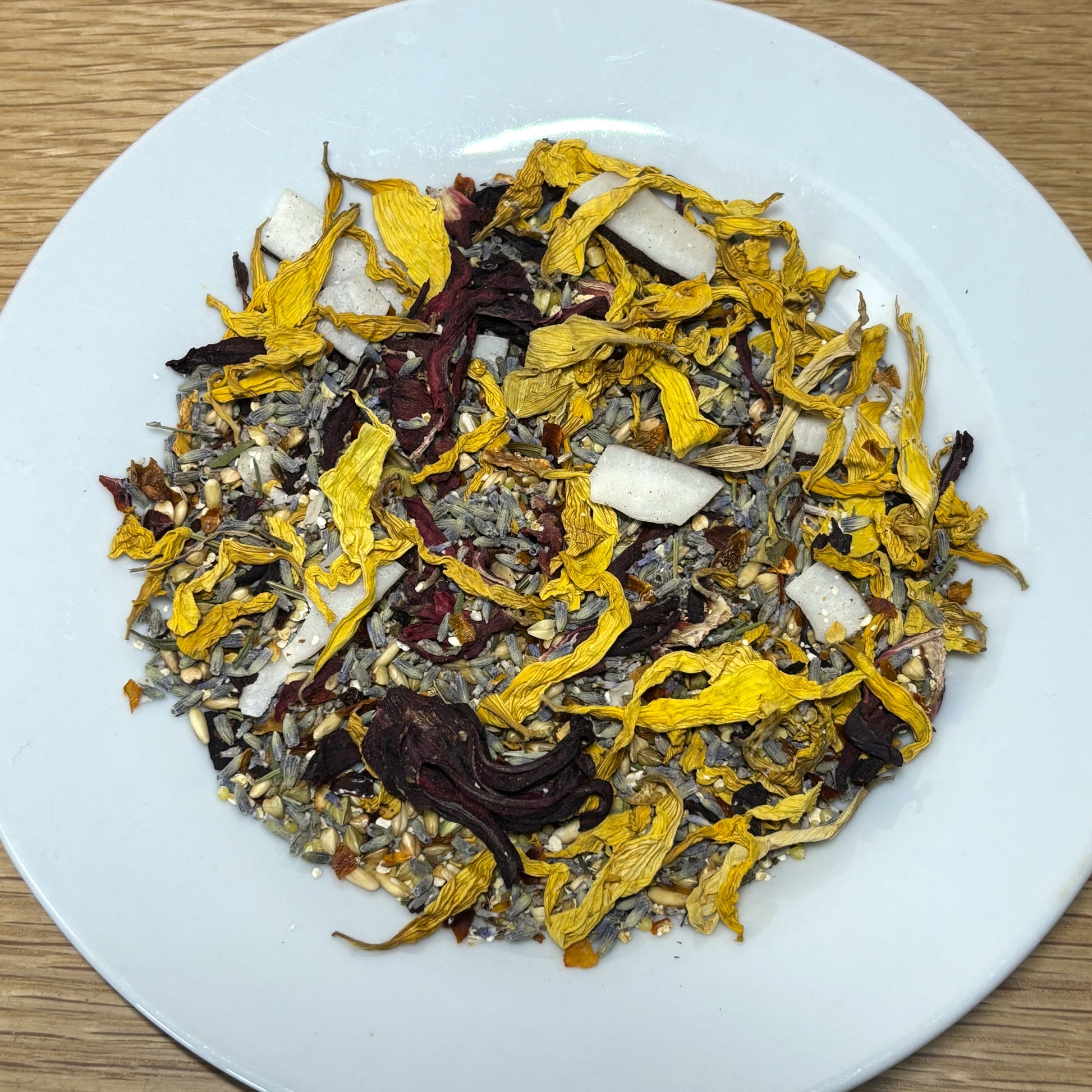 Buckwheat, Oat Groats, Hibiscus, Chilli Flakes, Coconut, Lemon Peel, Millet, Sunflower Petals, Lavender.